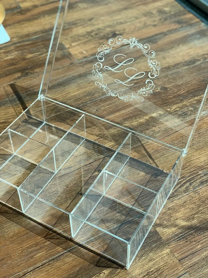 Caixa de padrinhos em material acrílico personalizada em laser, para maior composição e elegância do lavabo em seu evento.
